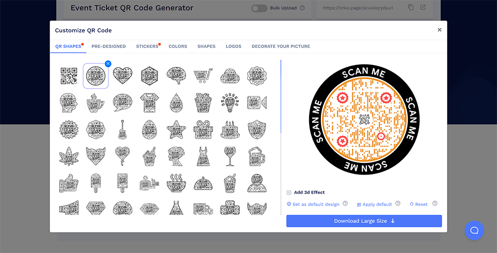 Click the 'QR Code' tab to customize your QR Code design (e.g., adding shape, color, and sticker). Click the 'x' icon of the 'Customize QR Code' popup to save changes.