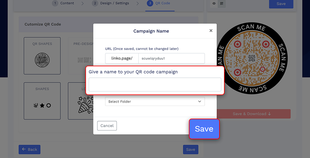 Click the 'Save' button. Enter the QR Code name, edit the URL (optional), select folder (optional), and click 'Save.'