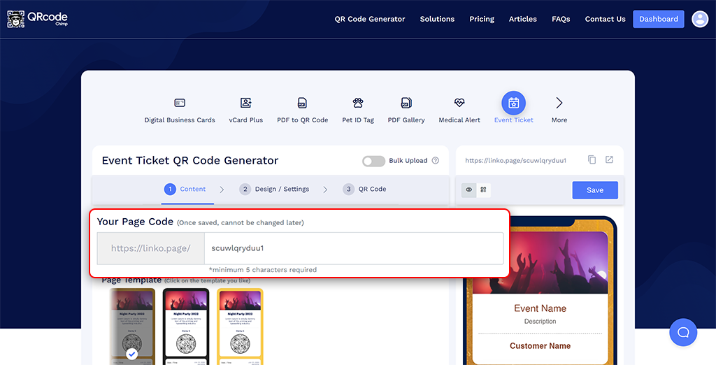 Customize the event ticket URL to your preference (optional). Note: Once saved, you cannot change it.