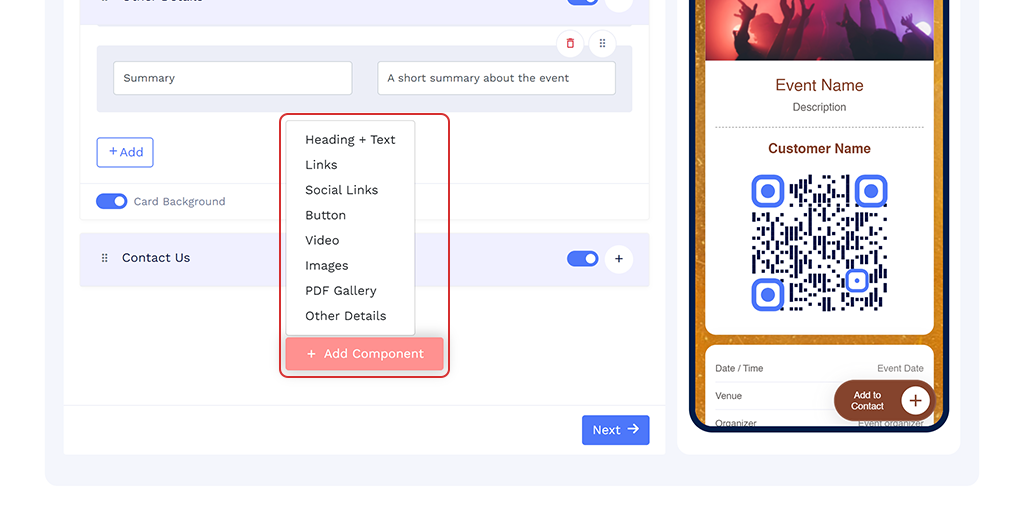 Click 'Add Component' to add sections such as images, videos, buttons, and more (Optional).
