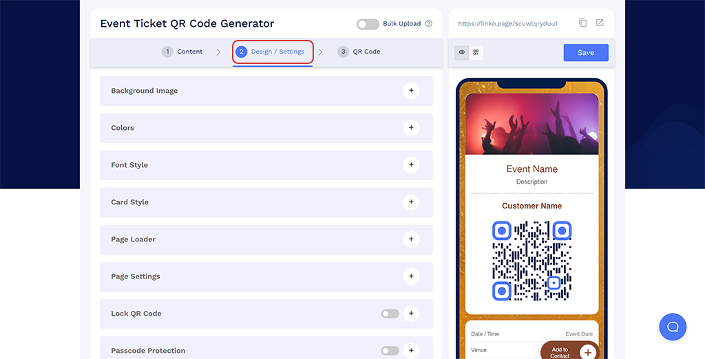 Click the 'Design/Settings' tab to customize the page design with background image/video, colors, font style, card style, page loader, and more.