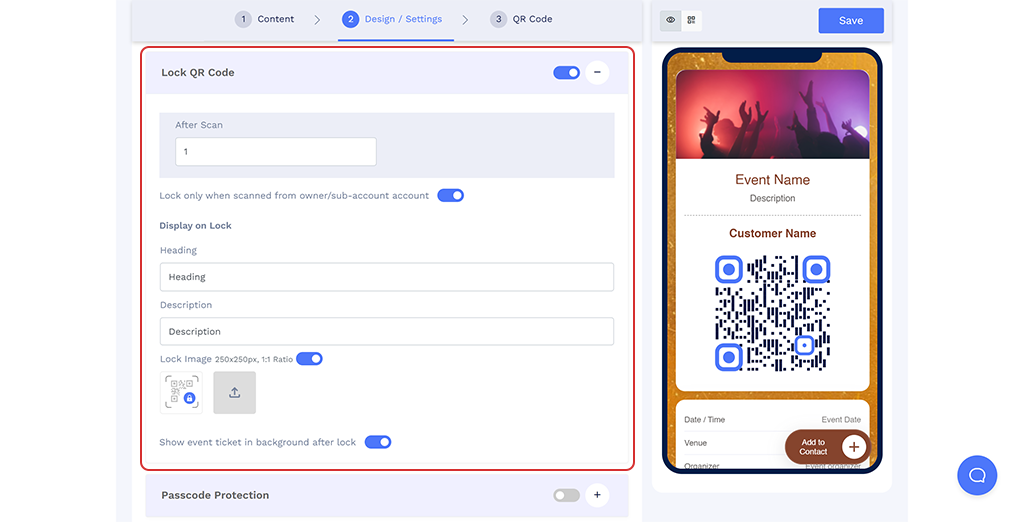 In this section, you can set the lock screen design, i.e., the header, description, and lock image that is displayed once the QR is locked.