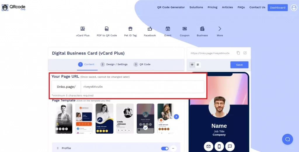 Customize the free digital business card page URL to your preference (optional).