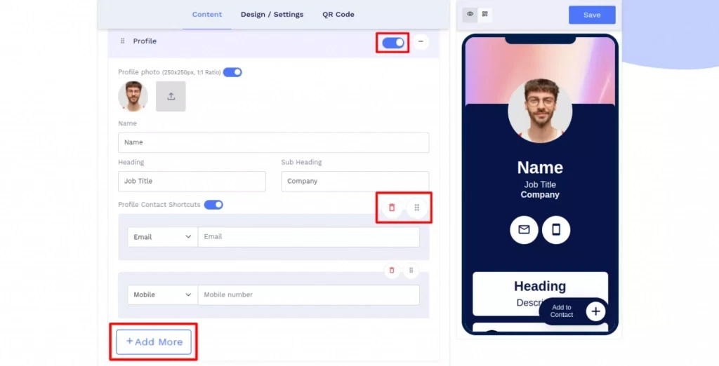 Enter your profile details, contact details, social links, images, weblinks, etc. You can also add additional sub-components by clicking on the 'Add' button of the respective component.