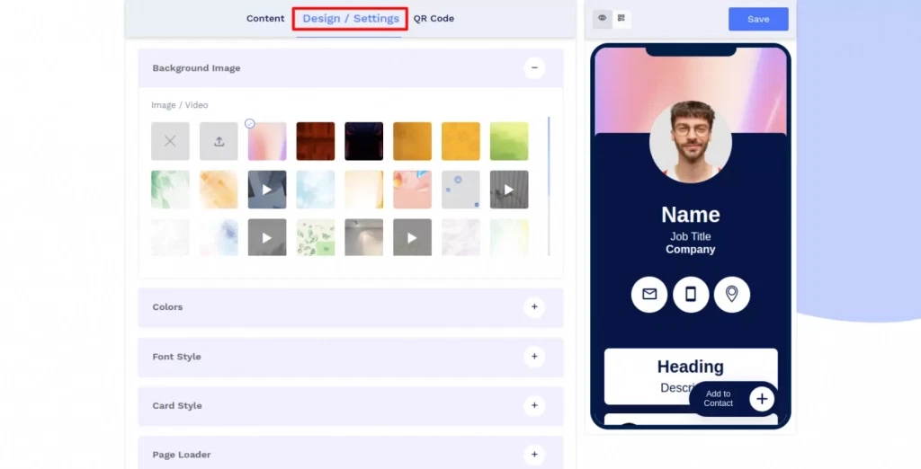 Click on the 'Design/Settings' tab to customize the page design with background image/video, colors, font style, card style, and page loader.