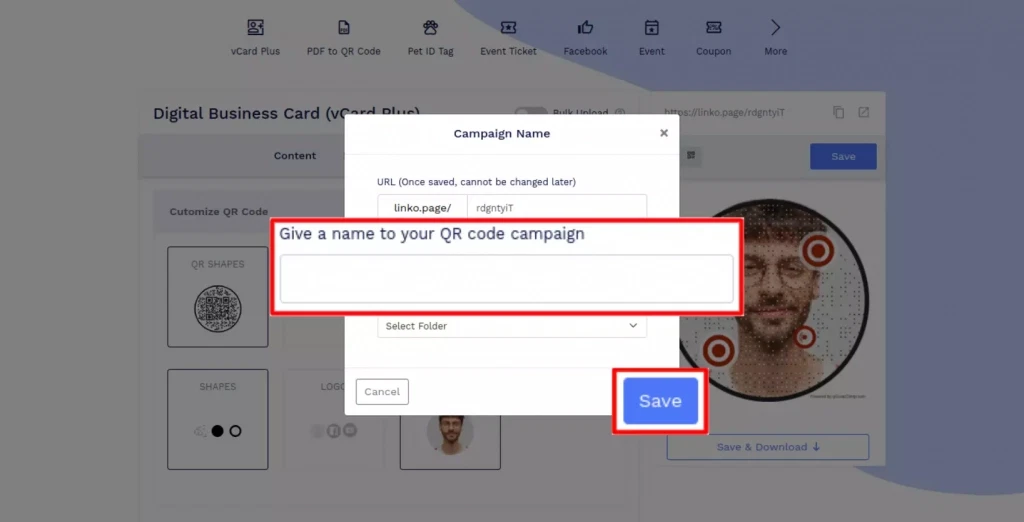 Click on the 'Save' button. Enter the QR Code name, edit the URL (optional), select folder (optional) and click on 'Save.'