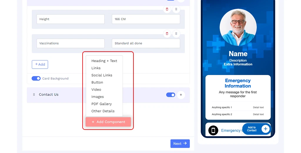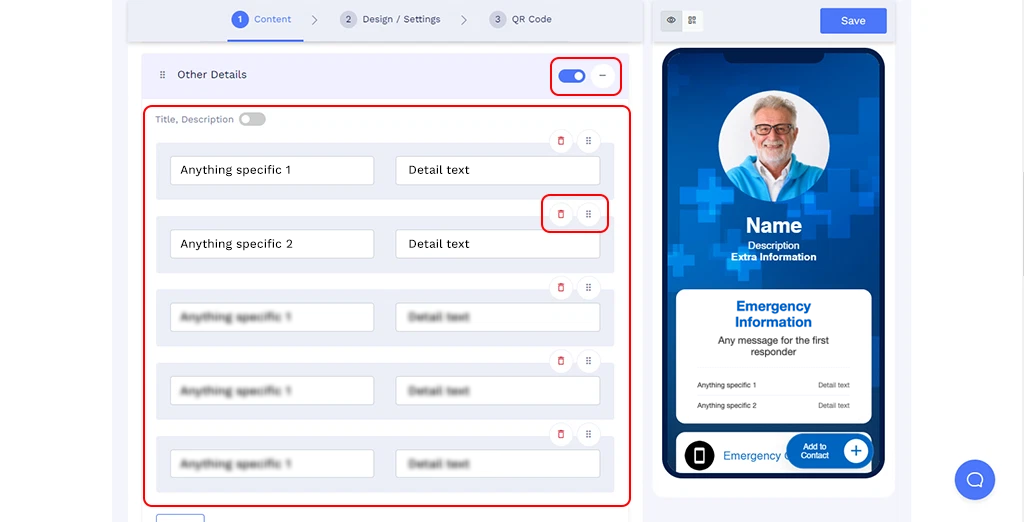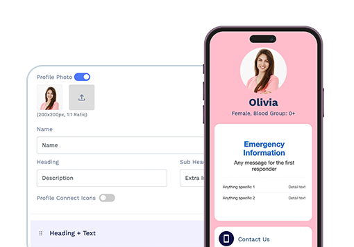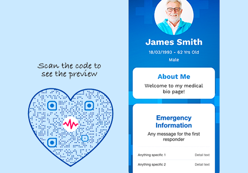 While the QR Code displays comprehensive information, the linked online profile can prioritize necessary information. You may rearrange the order of information as needed to ensure important details are seen first in emergencies.
