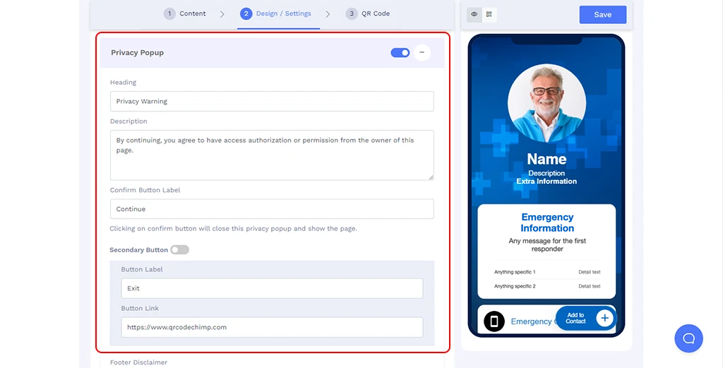 Whenever someone scans your medical ID, they will get a Privacy Popup. You can change or edit it here.