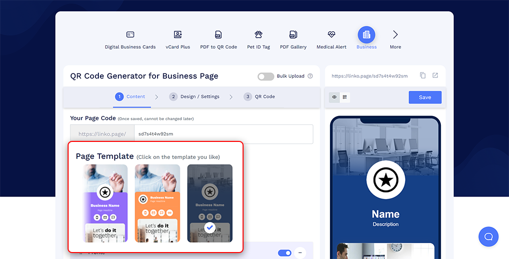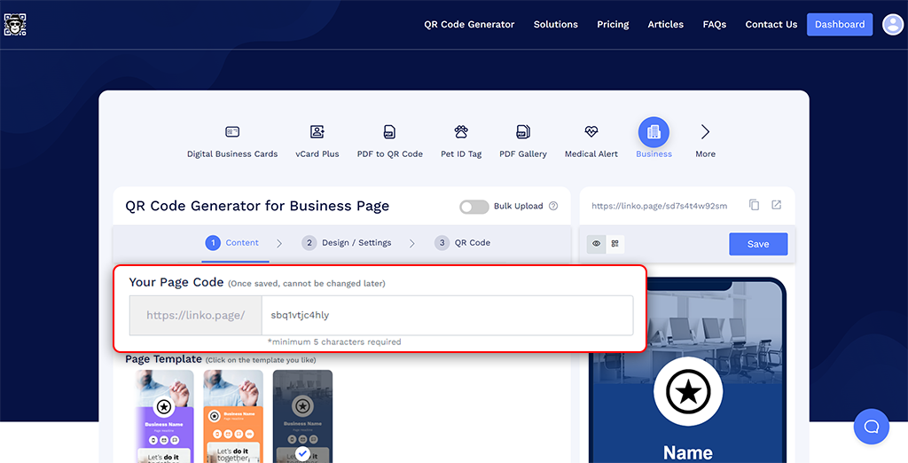 Customize your business page URL in the Content tab by editing the page code for a more personalized touch.