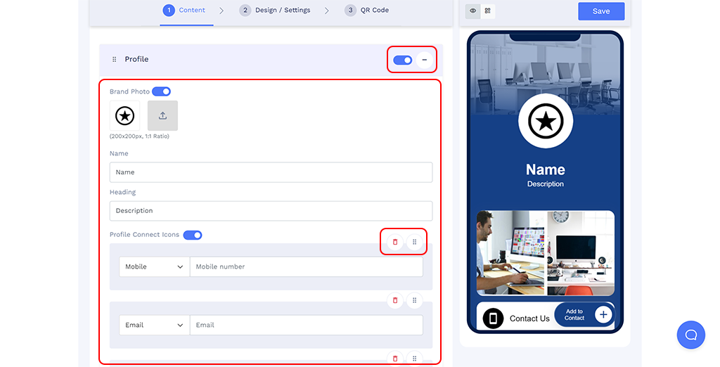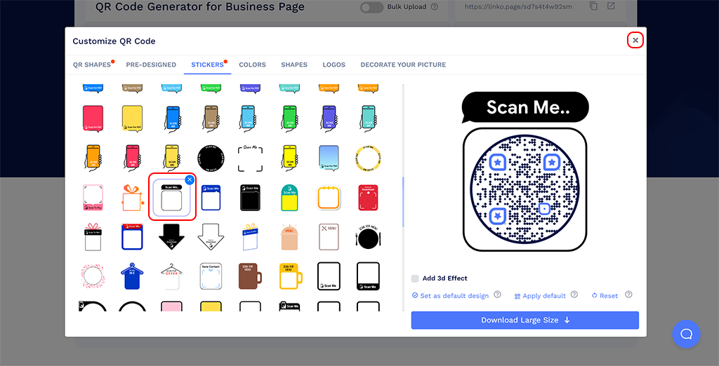 In the QR Code tab, you can modify the QR Code design using QR shapes, colors, logos, and other customizable options. Note: Remember to click on the 'x' icon of the popup to save any changes made.