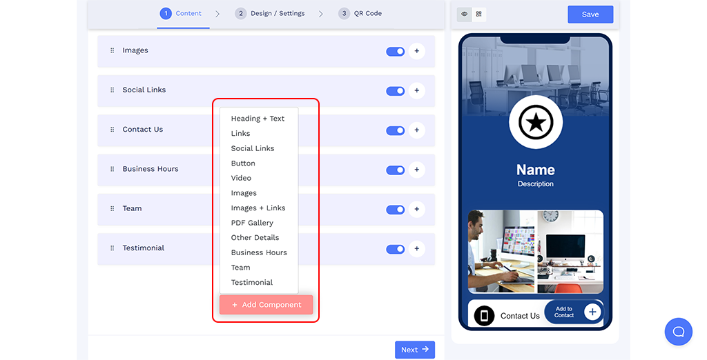 Click 'Add Component' to include additional sections like ‘Image+Links’ or ‘Video’.