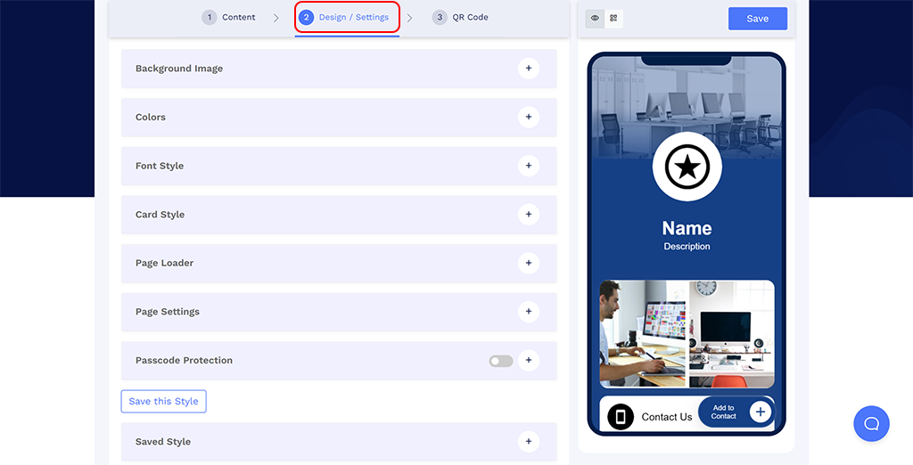 In the Design/Settings tab, modify the page design to match your brand. You can change the background image or video, colors, font style, and more. Note: You can also set your emails to receive email notifications of scans.