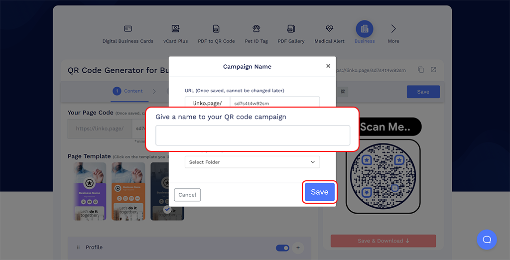 Click on the 'Save' button. Enter the QR Code name, edit the URL (optional), select folder (optional), and click on 'Save.' Note: Make sure to scan your QR Code from different devices (iOS and Android) before printing for production. This will ensure that the QR code is easy to scan and functions as intended.