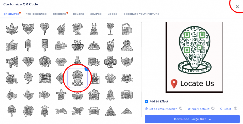 Note: Click on the 'x' icon of the 'Customize QR Code' popup to save changes.