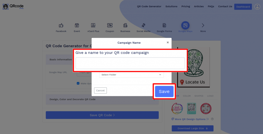 Save the QR Code by clicking on the 'Save QR Code' button, entering the QR name, and then clicking on 'Save.'